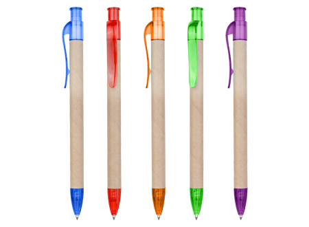 Bolígrafo Ecológico “Planet” de cartón reciclado, con terminales de color traslúcido. Escritura azul.